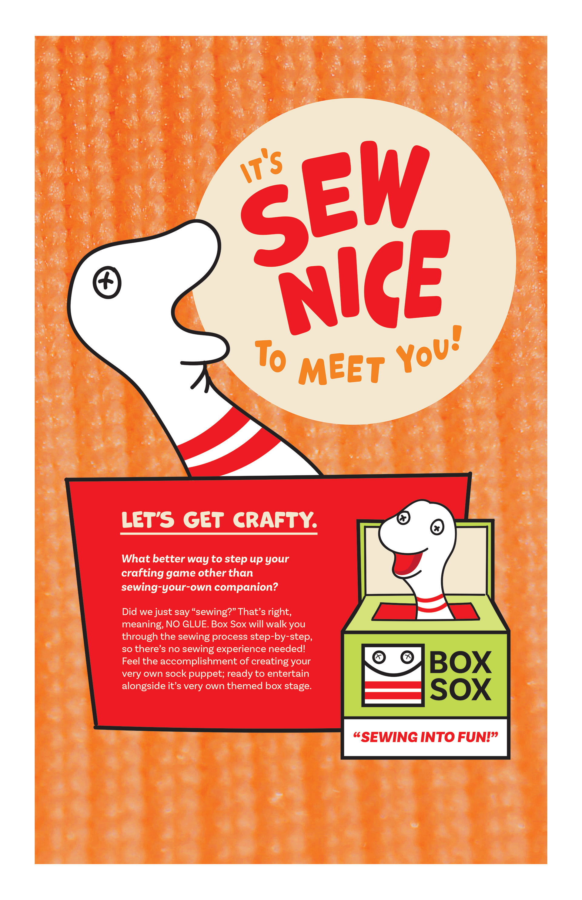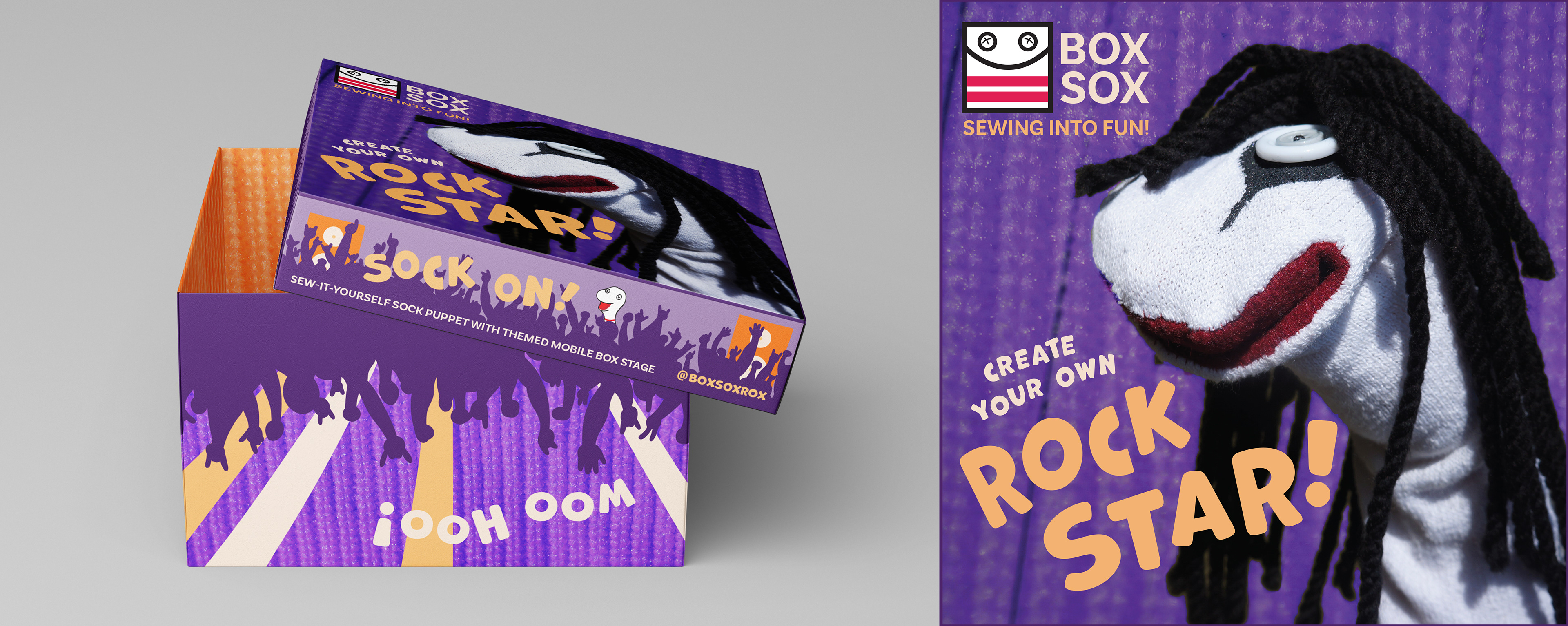 Box Sox is a sew-it-yourself sock puppet which lives inside it's very own mobile box stage. This is a passion project combining playful branding and creative packaging design.